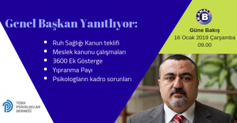 Genel Başkanımız Doç. Dr. Okan Cem Çırakoğlu, 16 Ocak 2019 saat 09.00’da Kanal B’de Güne Bakış programına katılarak gündemdeki Ruh Sağlığı Kanun teklifi ve psikologların mesleki sorunları hakkında gelişmeleri paylaşacak.