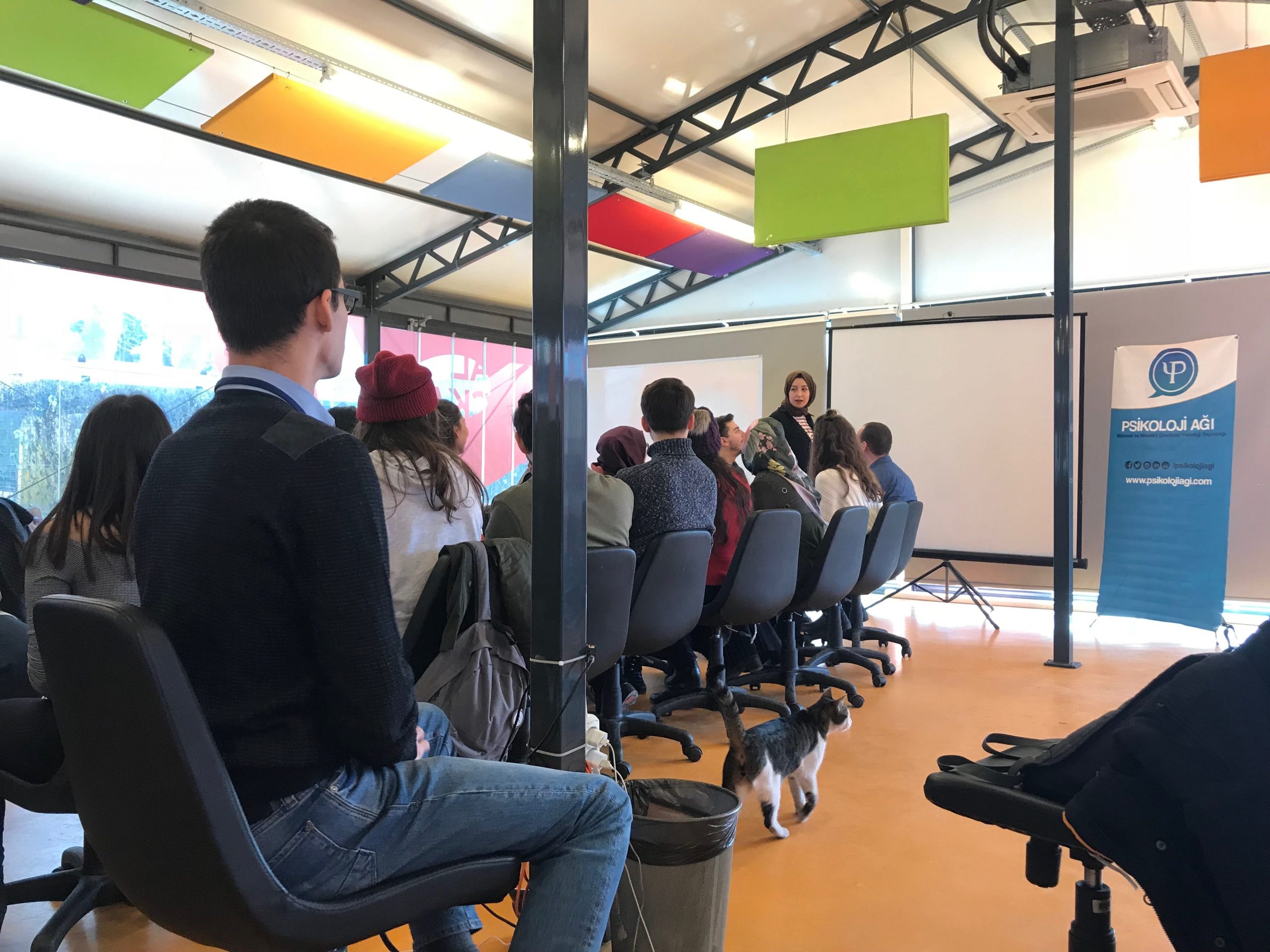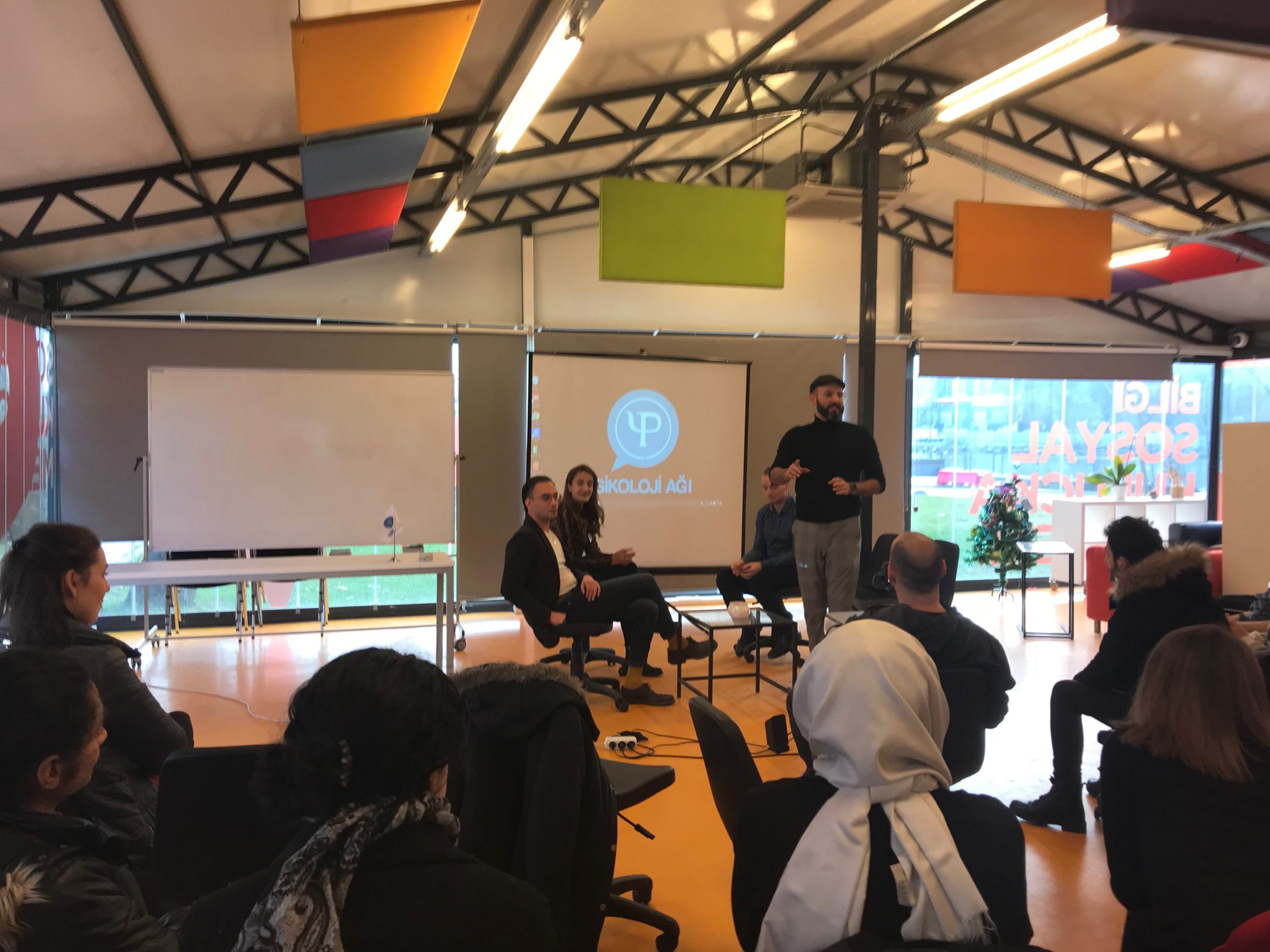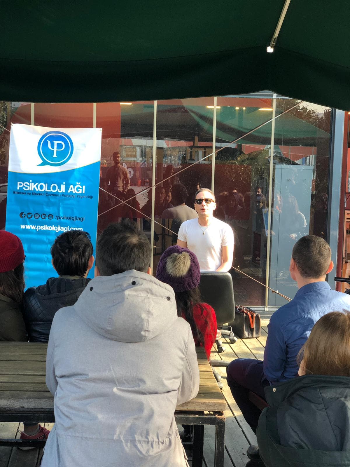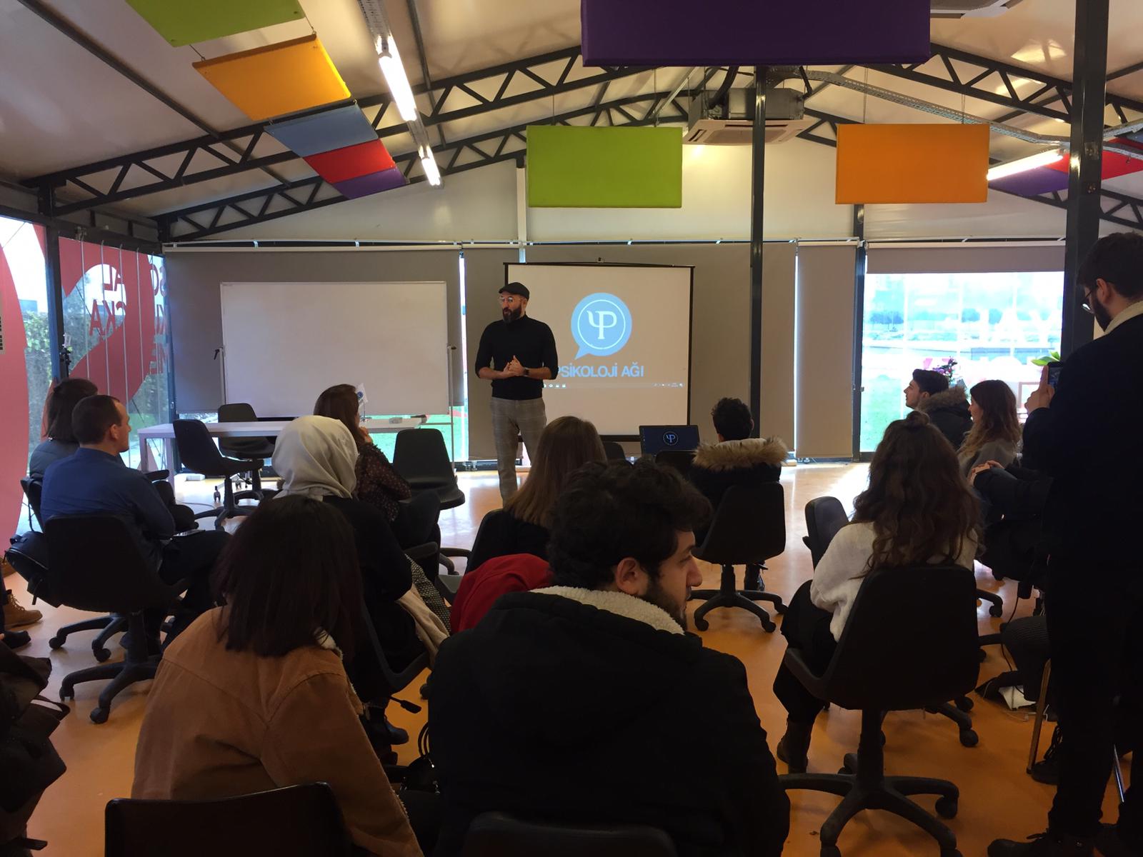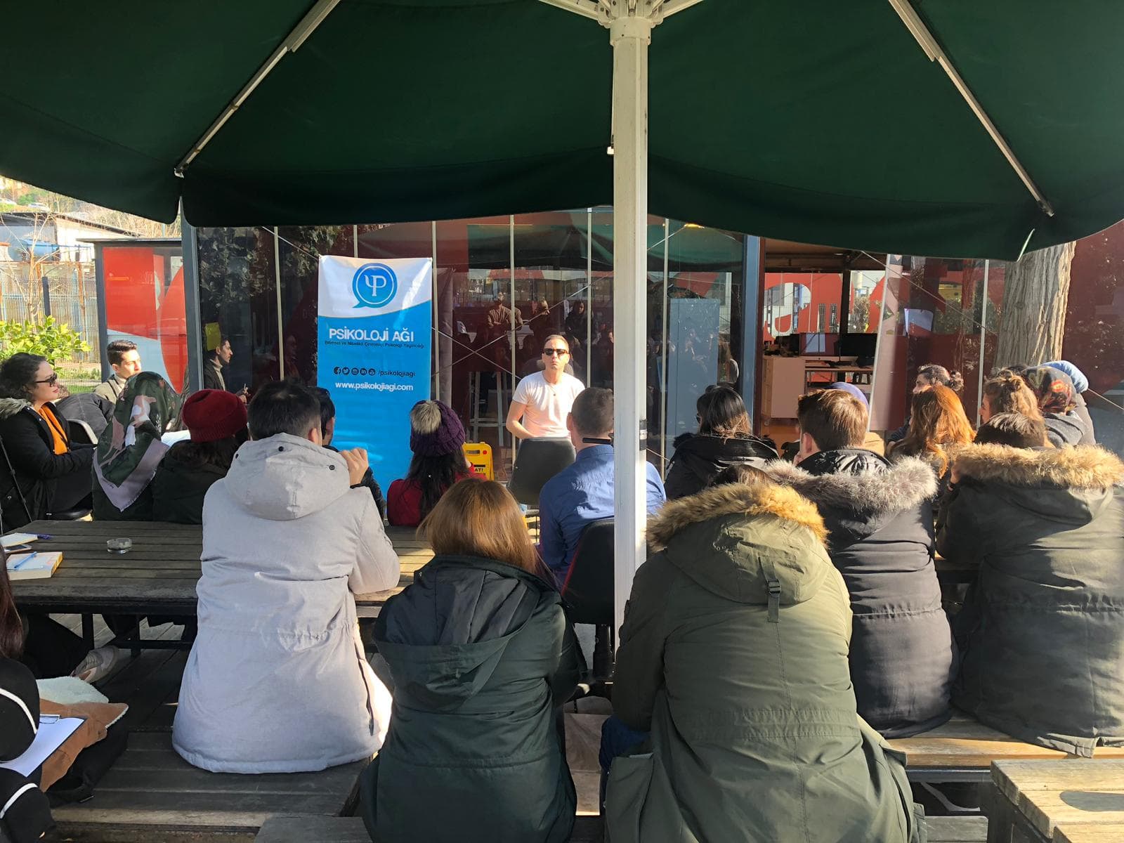 2019 yılında daha fazla fiziksel etkinlik kararı alan Psikoloji Ağı, yılın ilk etkinliğini Sosyal Kuluçka Merkezinde Nöropsikolog Alkım Seven ve Uzman Klinik Psikolog Serdar Vatansever’in katılımıyla gerçekleştirdi. Etkinlik, Büşra Üstün’ün oryantasyon çalışmaları ile başladı. Oryantasyon, katılımcıları birbirleri ile kaynaştırmak, birbirlerini tanımaları için alan yaratmak ve samimi bir ortam sağlamak için gerçekleştirildi. Önce kendimizi tanıtıp yaptığımız en çılgınca şeyleri paylaştık sonra da ortak yönlerimizi aramaya koyulduk. Oldukça keyifli geçen çalışmaların ardından Nöropsikolog Alkım Seven havanın güzelliği ve katılımcıların enerjisiyle birlikte “Cinsiyet ve Kimlik” başlıklı konuşmasını bahçede gerçekleştirdi. İnteraktif ve eğitici geçen bir konuşma olmasının yanı sıra katılımcıların soru ve katkılarıyla keyifli bir şekilde devam eden etkinliğin daha fazla kişiye ulaşması için İnstagram üzerinden canlı yayın yapıldı. Seven’in konuşmasının ardından kısa bir mola verildi. Mola sonrasında psikoloji alanındaki uzmanlıkları tanıtmayı hedeflediğimiz projemizin ilk çalışması olan “Adli Psikoloji | Psikoloji Ağı Uzmanlık Serisi” videosunun gösterimi gerçekleştirildi. Gösterimin ardından, ekibiyle aramıza katılan Serdar Vatansever’in psikolojiyle ilgili kelime şakalarının karşılıklı gruplar arasında söylenerek gülmeme yarışı yaptığı “Soğuk Savaş” konseptinin video çekimi gerçekleştirildi.