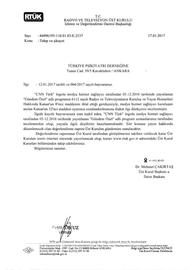 03.12.2016 tarihinde CCN Türk kanalında yayınlanan ‘Gündem Özel’ adlı Dr. Canan Karatay ve Dr. Ümit Aktaş’ın katıldığı programda depresyon, ruhsal hastalıklar ve tedavileri ile ilgili halkı yanıltıcı ve bilimsel dayanağı olmayan bilgiler verildiği gerekçesi ile 12.01.2017 tarihinde Sağlık Bakanlığı, İstanbul Tabip Odası ve RTÜK’e şikayet başvurularında bulunulmuştur. RTÜK tarafından gerekli incelemenin başlatıldığını belirtir yazı ektedir. Gelişmeler konusunda tekrar bilgilendirme yapılacaktır.