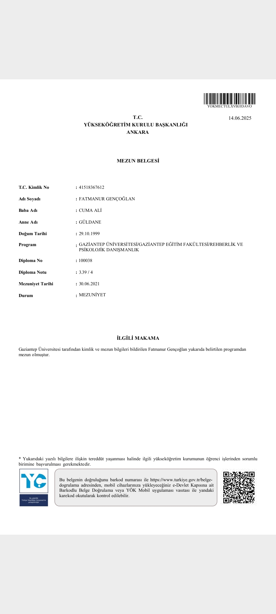 Fatmanur GENÇOĞLAN Kahramanmaraş Onikişubat • Sep 2025'den beri Randevu Al Randevu Al × Randevu talebiniz sonrası ekip arkadaşlarımızca tarafınıza dönüş sağlanacaktır. Verimli bir süreç dileriz. Ara / Whatsapp / Form Doldur / Screenshot_2025-09-30-18-42-41-49_c37d74246d9c81aa0bb824b57eaf7062.jpg 1000 Ort. Ücret 5 Toplam görüşme sayısı Hakkında Fatmanur Gençoğlan, Gaziantep Üniversitesinde tamamladığı lisans eğitiminin ardından, insan gelişimi ve psikolojik süreçler üzerine yoğunlaşarak çeşitli...