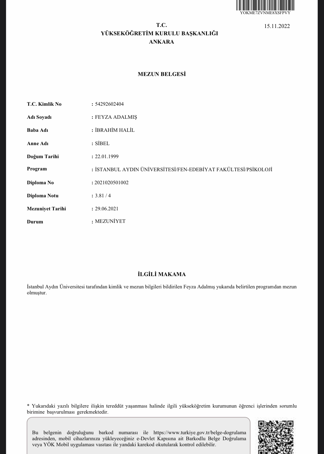 İstanbul Aydın Üniversitesi Psikoloji Bölümünden üçüncülükle mezun olduktan sonra Klinik Psikoloji alanında yüksek lisans eğitimi ile Klinik Psikolog unvanını almıştır. Lisans sonrası ve yüksek lisans sürecinde bilişsel davranışçı terapi ve psikodinamik terapi uygulamalarını süpervizyon eşliğinde tamamlamıştır. Lisans sürecinde Medicalpark Florya Hastanesi’nde ve T.C. Beylikdüzü Devlet Hastanesi’nde stajyer olarak görev almıştır. Yetişkin bireysel seanslarında Bilişsel Davranışçı Terapi ve Mindfulness  merkezli çalışmaktadır. Prof. Dr. Ebru Şalcıoğlu tarafından verilen Bilişsel ve Davranışçı Terapi Eğitimi’ni ve MOXO Türkiye’den MOXO Dikkat Performans Testi uygulayıcı sertifikalarını almıştır. Türk Psikologlar Derneği Üyesidir.
