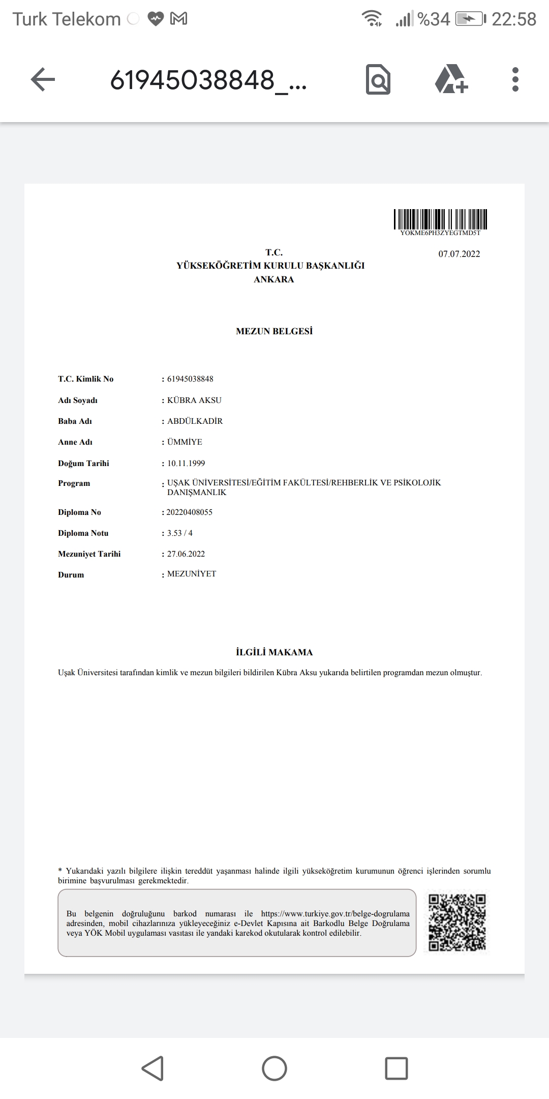 Merhaba, Uşak Üniversitesi Psikolojik Danışman ve Rehberlik bölümünden yüksek onur derecesi ile mezun oldum. Bir anaokulunda psikolojik danışman olarak çalışıyorum. Ayrıca tercih danışmanlığı, akran mentörlügü ve bireysel danışmalar yapmaktayım. Çalışmalarımı yüz yüze veya online olarak gerçekleştirmekteyim. Lisans hayatımda başladığım psikoloji alanındaki eğitimlerimi tüm enerjimle almaya devam etmekteyim. Aldığım eğitimleri; Kısa Süreli Çözüm Odaklı Terapi, Tercih ve Kariyer Danışmanlığı, Çocuk Değerlendirme Testleri (WISC-R Zeka Testi, Metrapolitan Okul Olgunluğu, Dikkat testleri, AGTE..). Çalışma alanlarım ise; Bireysel danışmanlık,Özel yetenek öğrenci tanılama ve destek eğitimi, öfke ve duygu kontrolü, kaygı ve korkular, sınav kaygısı,çocuk ve ergenlerde gelişim dönemi problemleri, travmalar, kardeş kıskançlığı, iletişim problemleri…